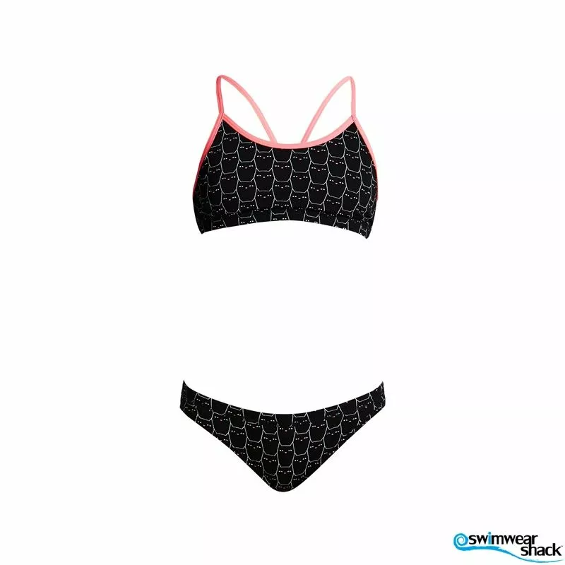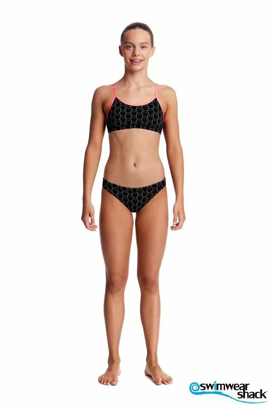 A firm fitting crop top and hipster brief suited to the sporty girl. It’s a secure fit with underbust and waist elastic and drawcord in the brief. Features a single shoulder bind strap finish. Available in sizes 8 – 14.
