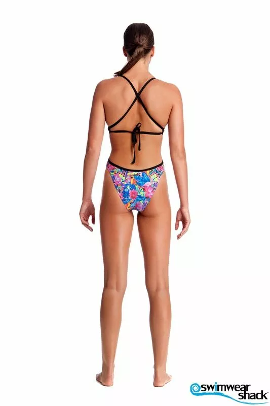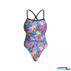 Cut away sides with a tie back, minimal back coverage and a moderately high leg, make this the perfect training suit for summer. Features full front lining and single strap binds and is available in sizes 6 – 12. Â