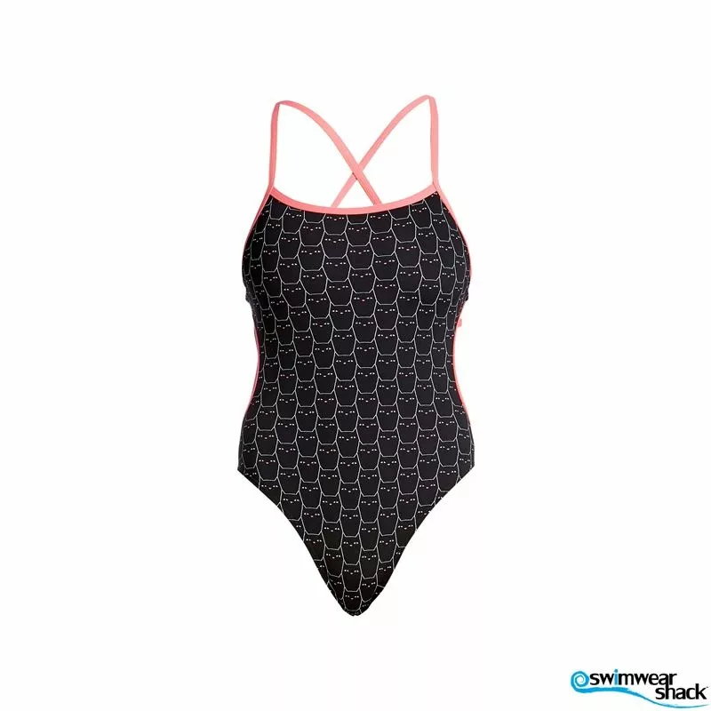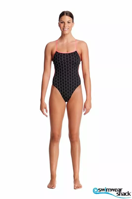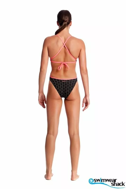 Cut away sides with a tie back, minimal back coverage and a moderately high leg, make this the perfect training suit for summer. Features full front lining and single strap binds and is available in sizes 6 – 12. Â