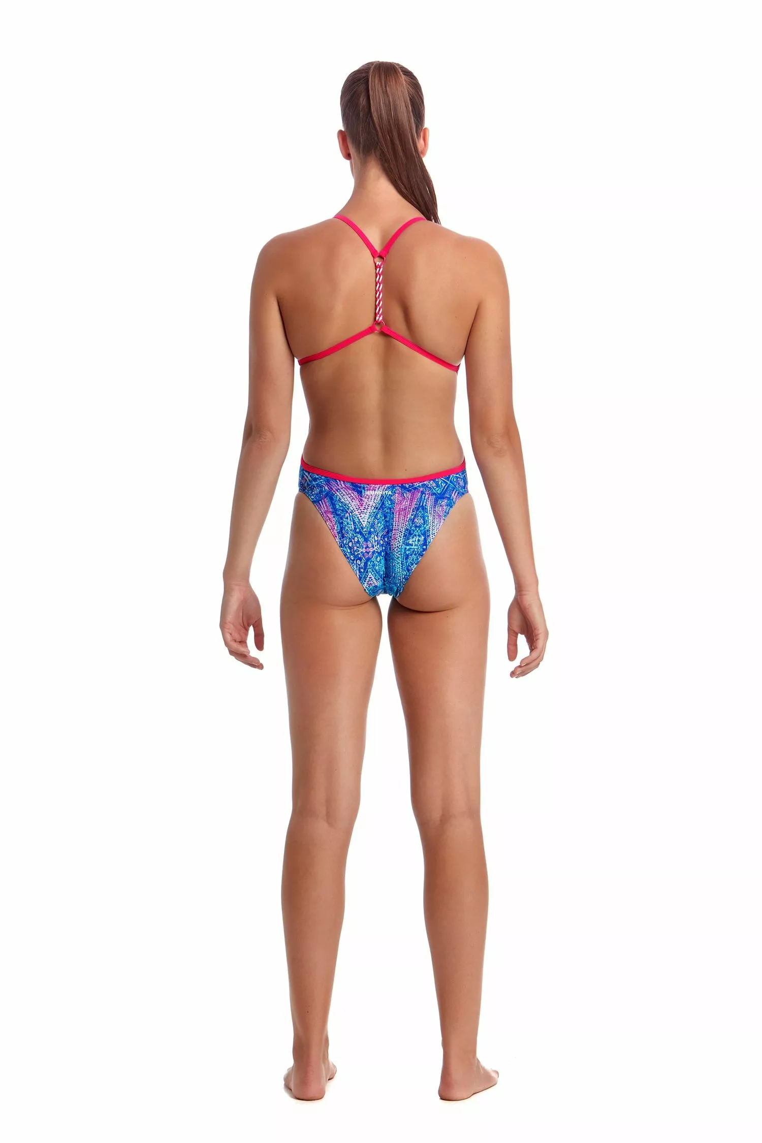 Featuring single bind straps that converge into a twist at the back this high leg one piece features full front lining, cut away sides and minimal back coverage to give you plenty of freedom of movement when you’re training your hardest. Available in sizes 6 – 12.