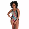 A high back, high neck one piece with a mesh panel across the chest and zip fastening to secure at back. Panelled to create a strong silhouette and lined with powermesh for an extra supportive fit. Moderate rear coverage. Available in sizes 8 – 16.