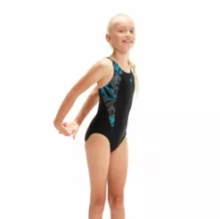 Iconic Speedo Style. This sporty black Muscleback swimsuit features a curved splice of our new ‘shattered’ Boom logo print in shades of azure blue and black. Great for longer swim sessions, the muscleback style enables your child to achieve a full range of motion during their swim. Quick-drying and stretchy to keep active kids comfortable, it’s made from Endurance10 fabric, which is designed to keep its shape
