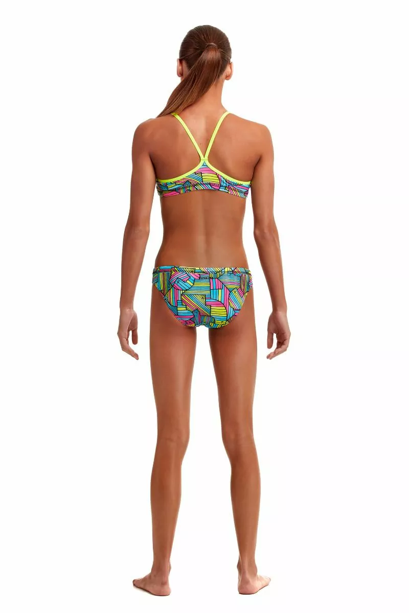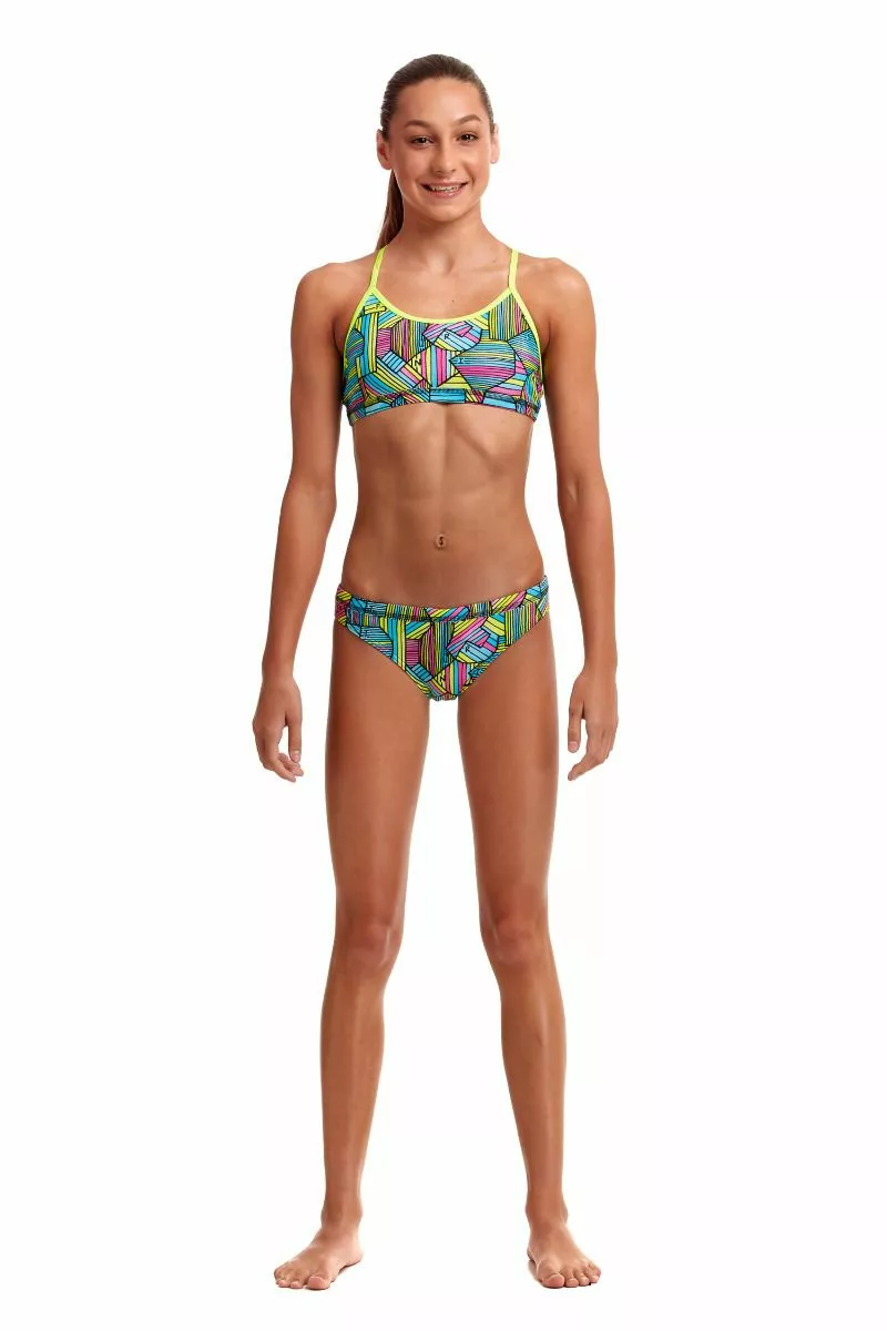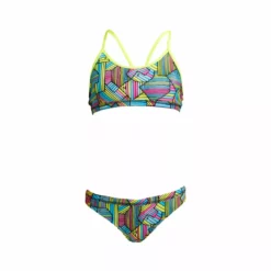 A firm fitting crop top and hipster brief suited to the sporty girl. It’s a secure fit with underbust and waist elastic and drawcord in the brief. Features a single shoulder bind strap finish.