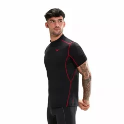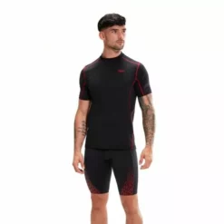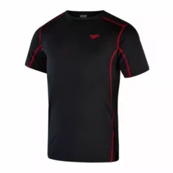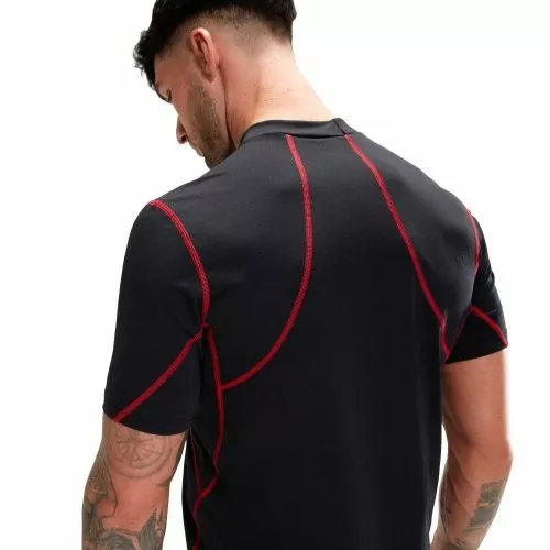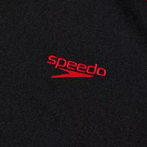 Performance swimwear for the outdoors. Our sleek black Short Sleeve Rash Top is designed to protect you against the elements outdoors and includes UPF40+ fabric sun protection. Ideal for use in and out of the water, the snug-fitting, pull-on style includes flatlocked seams for a comfortable fit against the body, whilst the striking red detailing has a tech-inspired aesthetic. Designed to be durable and better for the environment, the top is made from our new ECO Endurance+ fabric, which is 100% chlorine resistant, quick-drying, and made from 50% recycled materials.