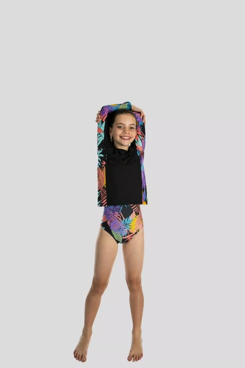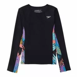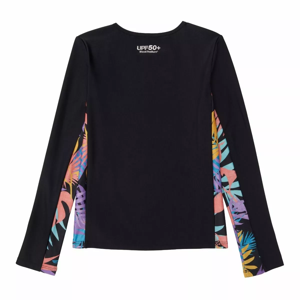 Prepare young swimmers for fun in the water with a durable rashguard. This fitted top features printed long sleeves and side panels. UPF rated, so she can splash all day.