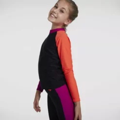 For endless adventures in the water. Whether in the pool or on the beach, this cool Long-Sleeve Rash Top with contrasting purple and orange sleeves has your child covered. Ideal for outdoor swimming and long days at the beach, it offers a pull-on style and a sun protection fabric rating of UPF 40+. Highly chlorine resistant, it’s suitable for the pool too and is made from our stretchy, shape-retaining Endurance10 fabric.