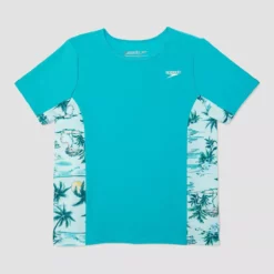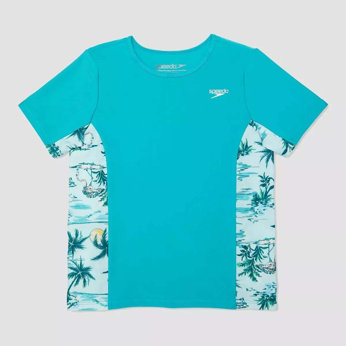 Worry-free aquatic adventures await when she wears this rashguard. This fitted top features printed short sleeves and side panels. UPF rated, so she can splash all day.