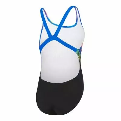 Colourful and fun our tropical fuse print will be the girls hero graohci this seasonmatching back to the perfect rashie as a set.The Leaderback style features V-shaped straps to give young swimmers full range of shoulder movement in the pool. Designed to be durable and better for the environment, it’s made from our ECO Endurance+ fabric, which is 100% chlorine resistant, quick-drying and made from 50% recycled materials.