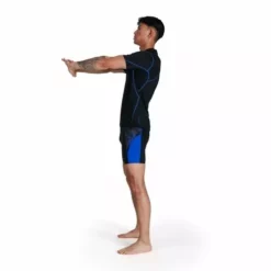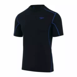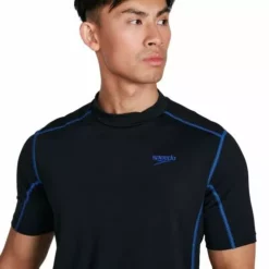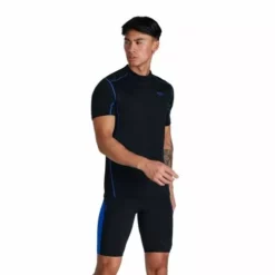 Performance swimwear for the outdoors. Our sleek black Short Sleeve Rash Top is designed to protect you against the elements outdoors and includes UPF40+ fabric sun protection. Ideal for use in and out of the water, the snug-fitting, pull-on style includes flatlocked seams for a comfortable fit against the body, whilst the striking blue detailing has a tech-inspired aesthetic. Designed to be durable and better for the environment, the top is made from our new ECO Endurance+ fabric, which is 100% chlorine resistant, quick-drying and is made from 50% recycled materials.