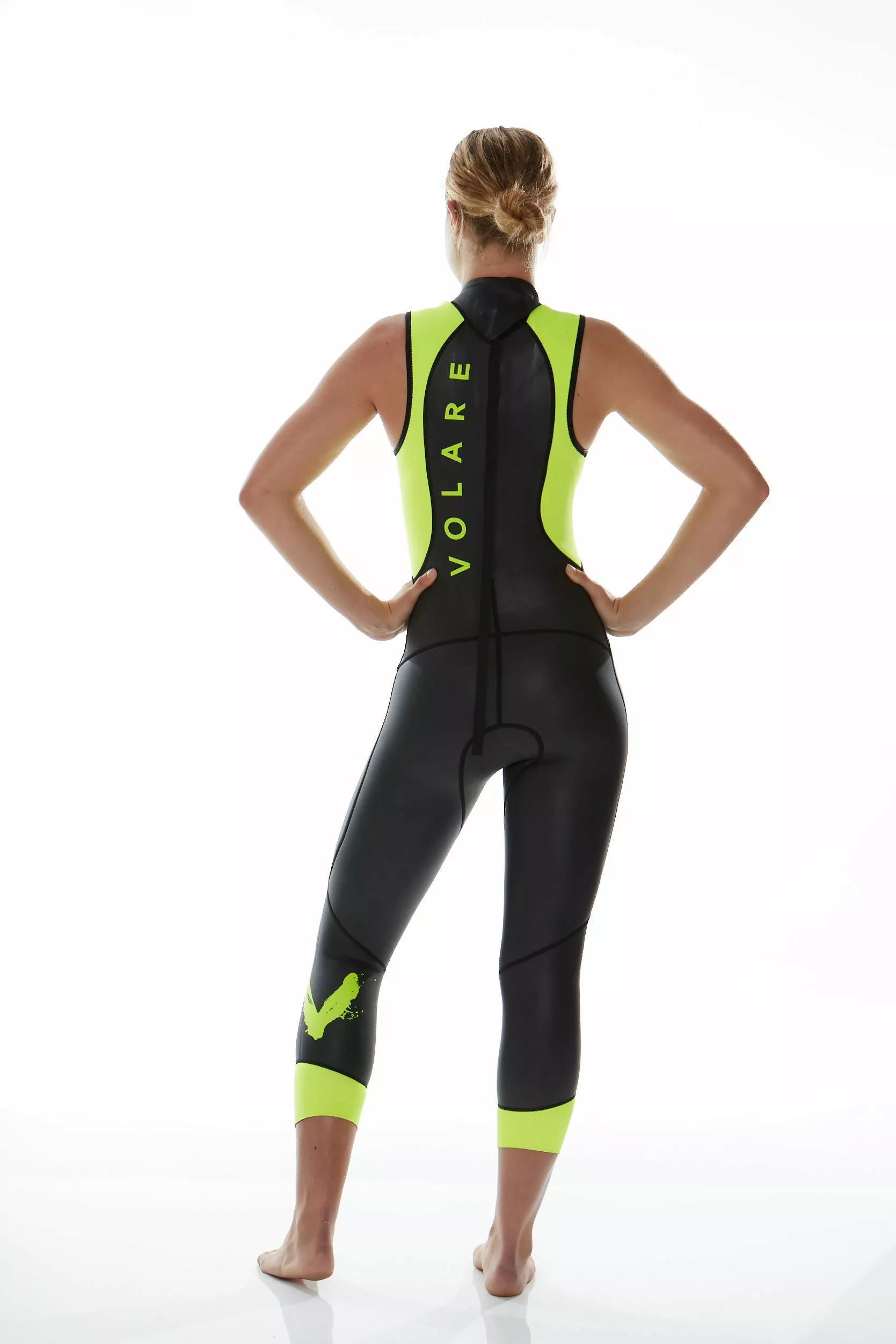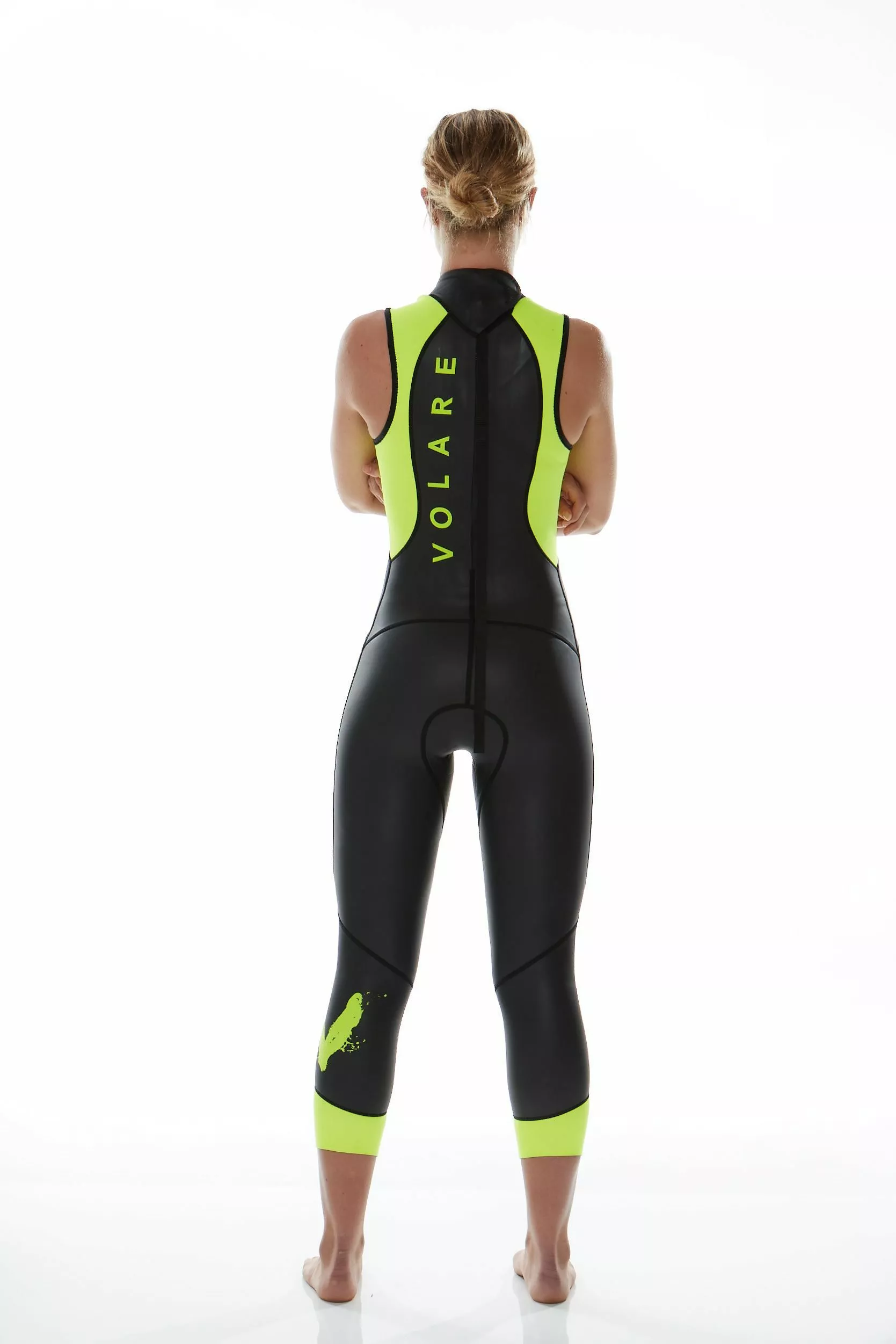The Volare V1 Sleeveless Triathlon Wetsuit is designed specifically for swimming and triathlon. Its neon yellow shoulders and leg panels make the suit highly visible in the water. Making this suit ideal for open water swimming, triathlon and surf lifesaving. In a sea of black neoprene, you will be sure to standout from the crowd.