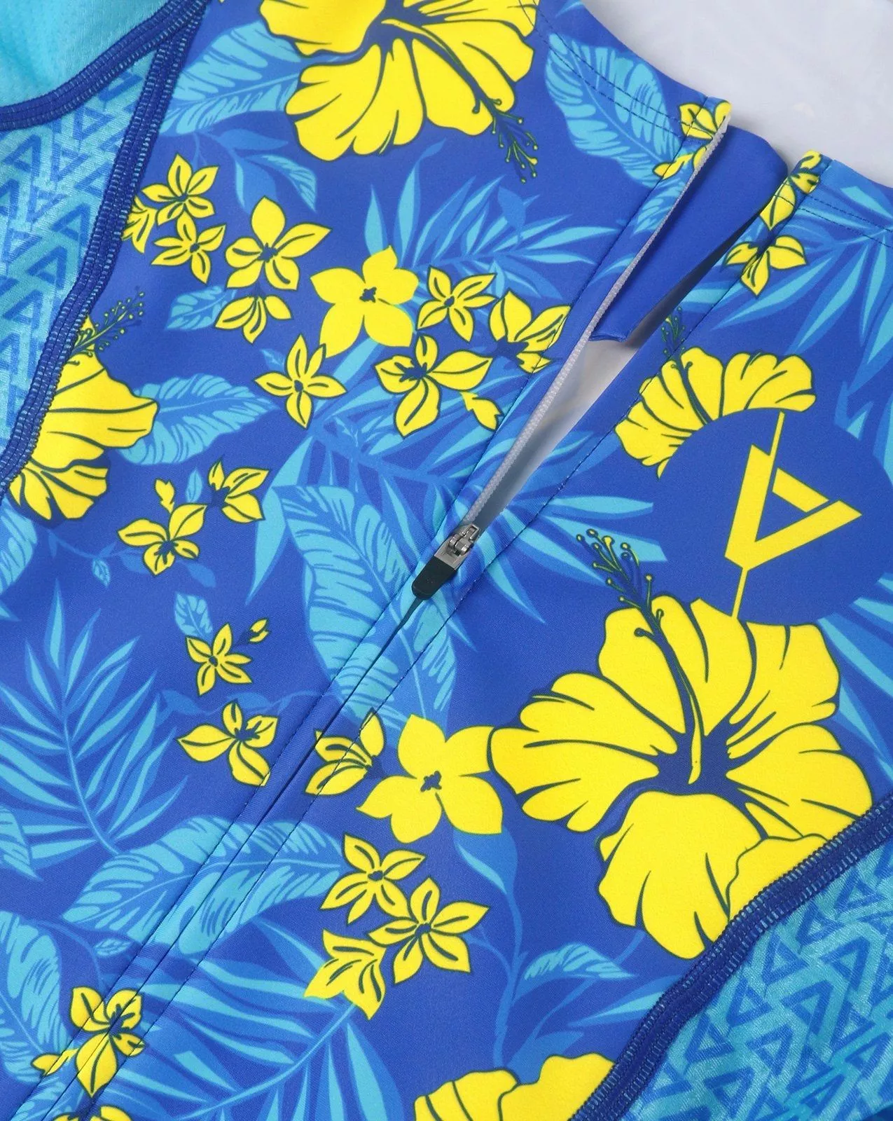 The Hibiscus sleeved tri suit is for the athlete who is at ease with their triathlon journey, who likes to have fun, appreciates performance, Â great fit and loves to chick the men while still managing to smile at the finish line. The Hibiscus sleeved tri suit offers faultless fit and unmatched aero performance, comfort and styling that’s as unique as you are.