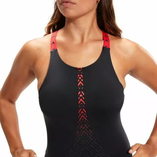 This sleek, tech-inspired Performance swimsuit is packed with technical innovations to help take your training to the next level. Striking in black with a graduated red plastisol print design and high cut leg, the suit includes smooth-fit comfort straps and a highly supportive 360 Powermesh bra liner for comfort during tough workouts. A specially placed performance seam enhances the suit’s streamlined shape, while anti-microbial technology ensures it stays fresh swim after swim. Designed to be durable and better for the environment, it’s made from our new ECO Endurance+ Pro fabric, which is 100% chlorine resistant, quick-drying, made from 50% recycled materials and has the added benefit of being finished with a water repellent and anti-microbial treatment.