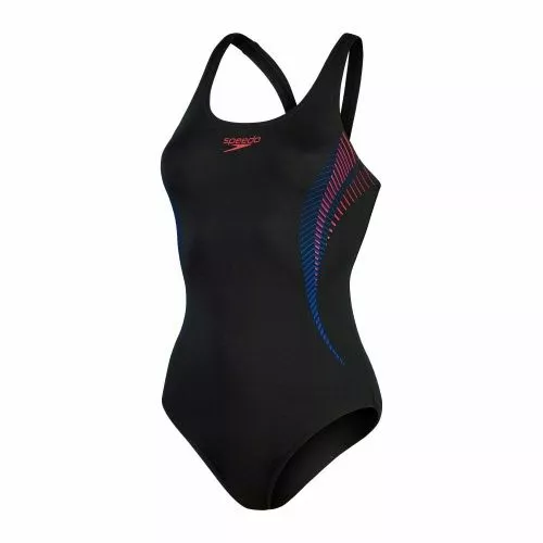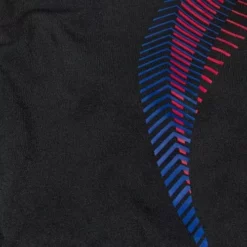 Streamlined, tech-inspired aesthetics. This sporty black Muscleback features a dynamic curved side panel design spliced with a red and blue plastisol print. The muscleback style offers flexibility during your fitness training and includes a medium neck and back opening, so you feel confident and secure as you move through your workout. Designed to be durable and better for the environment, the suit features our new ECO Endurance+ fabric, which is 100% chlorine resistant, quick-drying and made from 50% recycled materials.