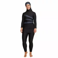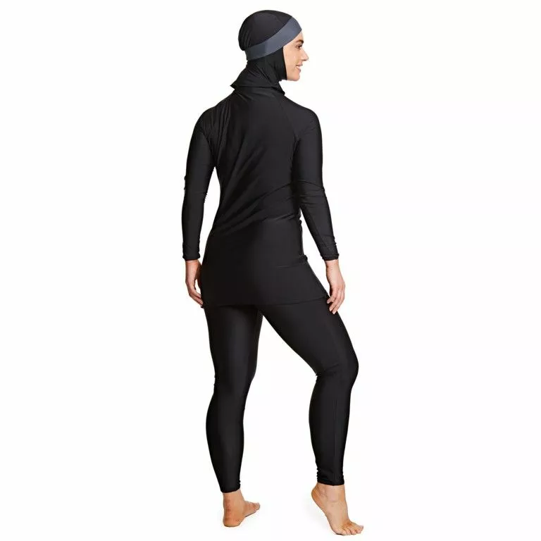 The Meelup 3 piece Modesty Suit is designed for looking good and swimming comfortably and perfect for those trying to limit their sun exposure, The top is designed to be long enough to cover the whole torso while tie cords attach the top to the trousers so everything stays in place, as well as buttons to affix the headpiece. Features our signature Sandon stripe panels.
